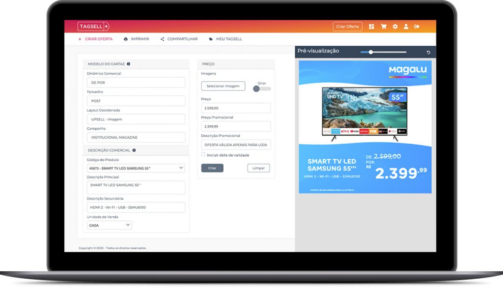 Com Tagsell, você economiza muito mais. Afinal, somos uma solução multiplataforma, que permite a impressão em todos os tipos de impressora. Você otimiza o uso do formato A4, onde é possível imprimir 8 cartazes diferentes utilizando nosso tipo de papel especial, que é muito mais barato do que o papel cartão usado no processo manual.